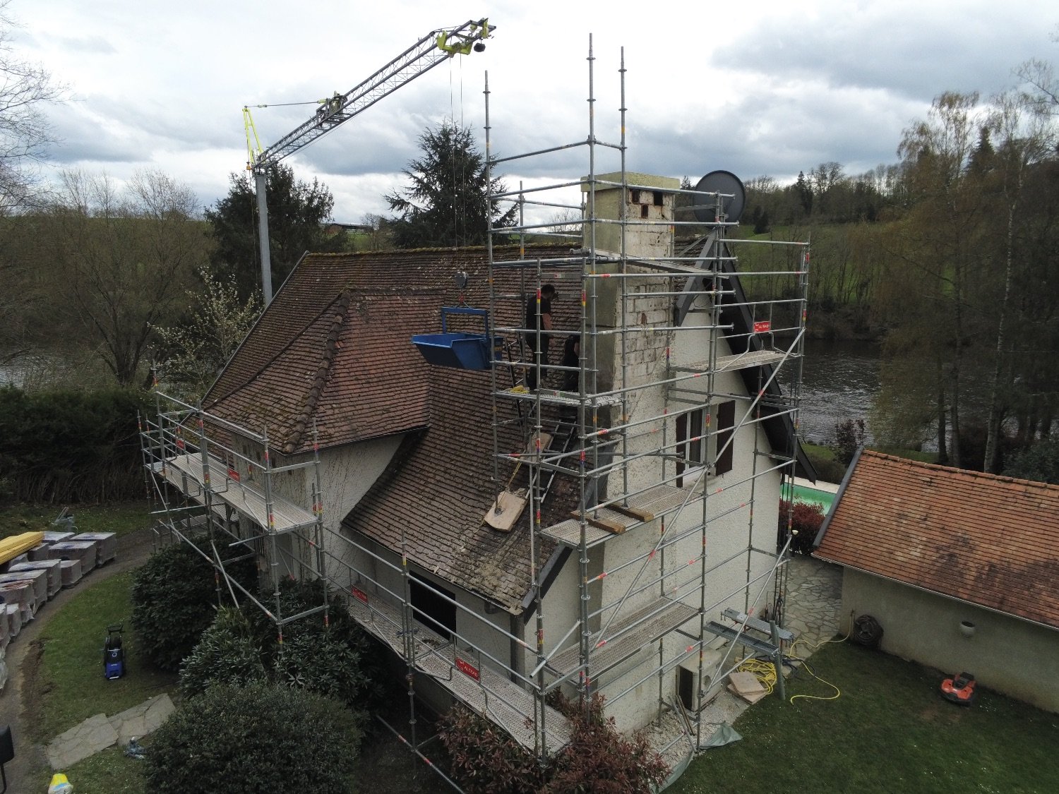 Une fois toutes les tuiles en place, nous avons procédé au démontage de la grue à tour, suivi du démontage de l’échafaudage. Cette étape marque la fin des travaux en hauteur et permet de libérer l’espace autour du bâtiment.
